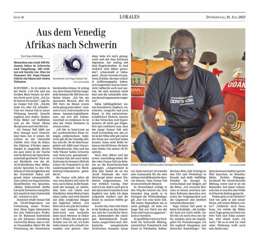 Er qualifiziert sich zur Fachkraft für kulturelle Bildung, unterrichtet Französisch und Kunst in Wiesbaden, Kaltenkirchen, Köln, hält Vorträge in den USA und Workshops in Kanada und stellt vielfältige Projekte im Senegal, in Deutschland und Belgien auf die Beine. „Ich versuche Brücken zu bauen zwischen Ländern, Kulturen, Sprachen, zwischen der Vergangenheit und der Gegenwart und letztlich zwischen Menschen.“ In Schwerin ist Oumar Fall beim Dreescher Stadtteilfest am 21. Juni 2025 auf der Wiese am Fernsehturm dabei.